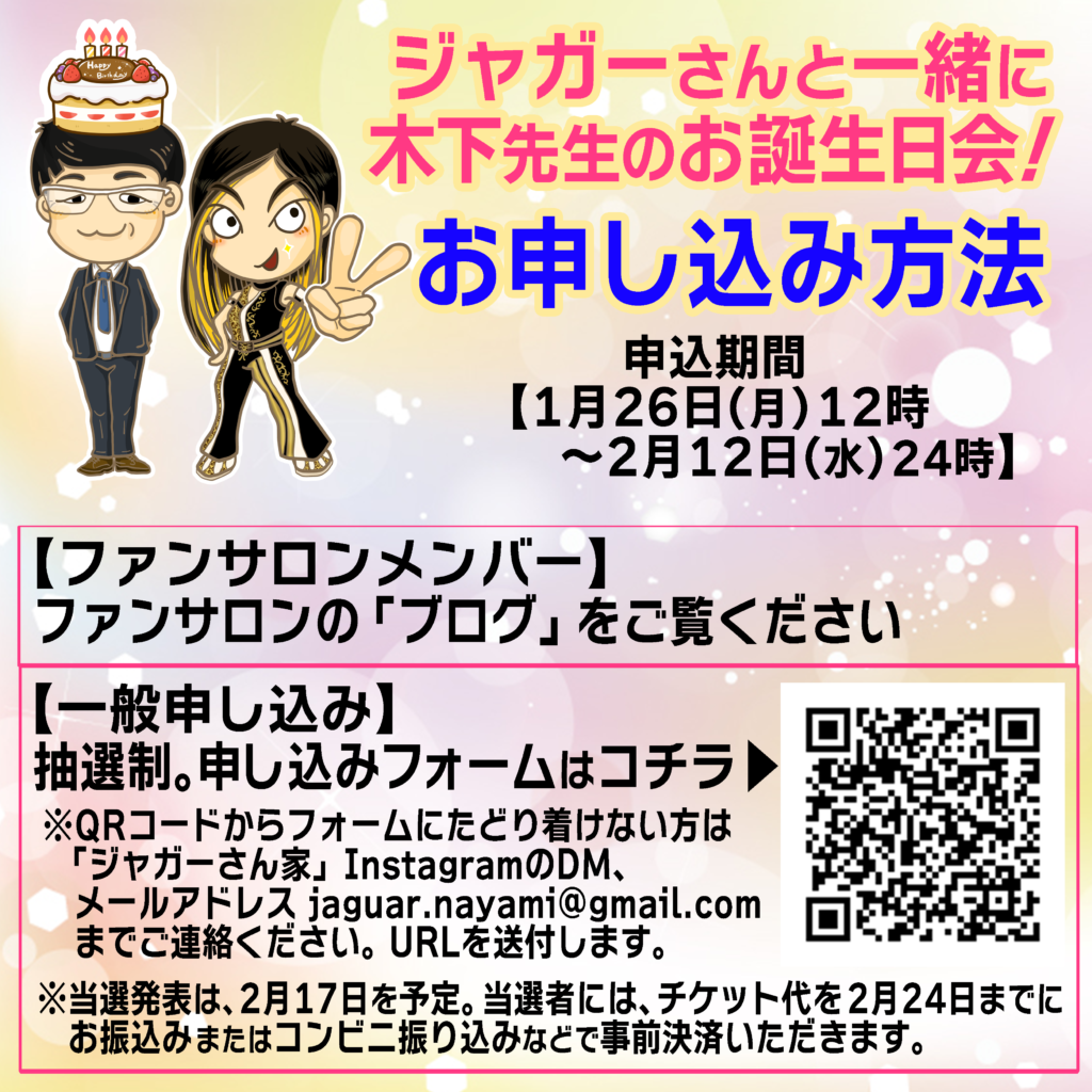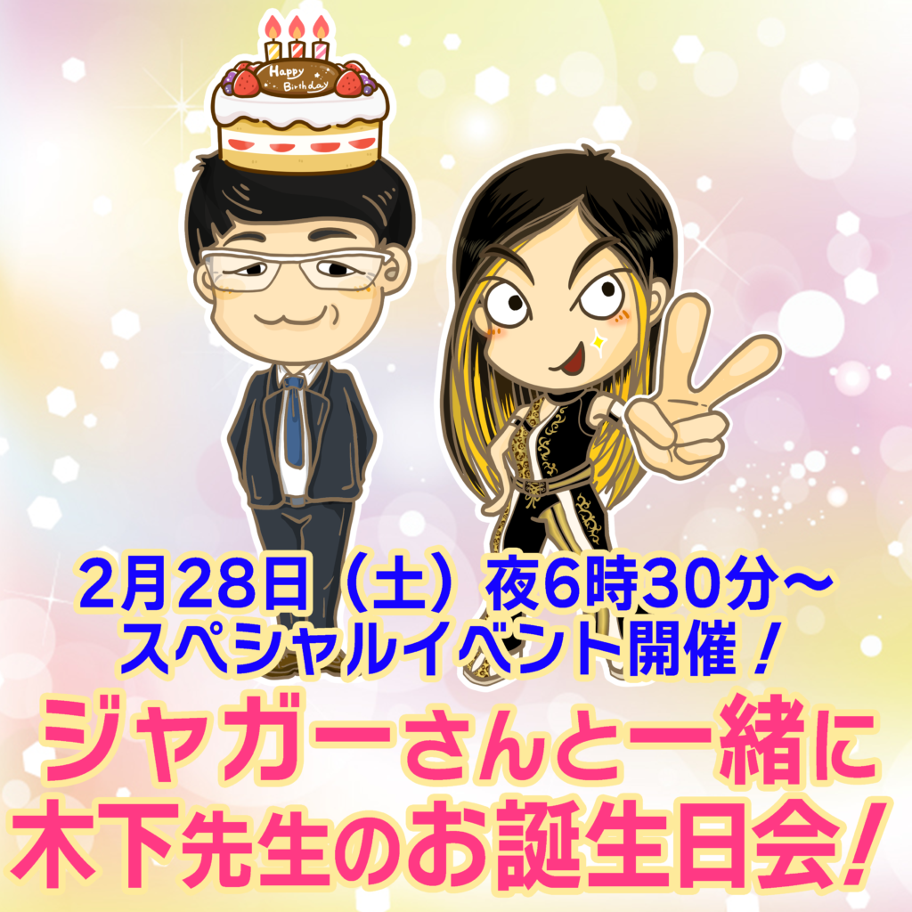 【イベント情報】2026年2月28日・少数ファンミ開催「ジャガーさんと祝う 木下先生の誕生日会」 2026 2/15 お知らせ・出演情報 2026年2月15日 10人限定の少数ファンミーティングとなりますので、抽選制とさせていただきます。 「ジャガー横田ファンサロン」メンバー優先とさせていただきます。 ファンサロン入会(月額880円)▷ https://www.fan.salon/jaguar お知らせ・出演情報 シェアお願いします! URLをコピーしました! URLをコピーしました! 【イベント情報】2026年2月1日(日)大船観音寺「節分の豆まき」に出演 【イベント出演情報】2026年3月8日(日)荒川区の防災イベントで、1日消防署長を務めます