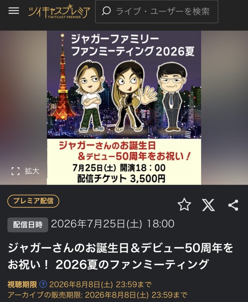 「ジャガーさんのお誕生日&デビュー50周年をお祝い!2026夏のファンミーティング」の配信チケットを販売します!